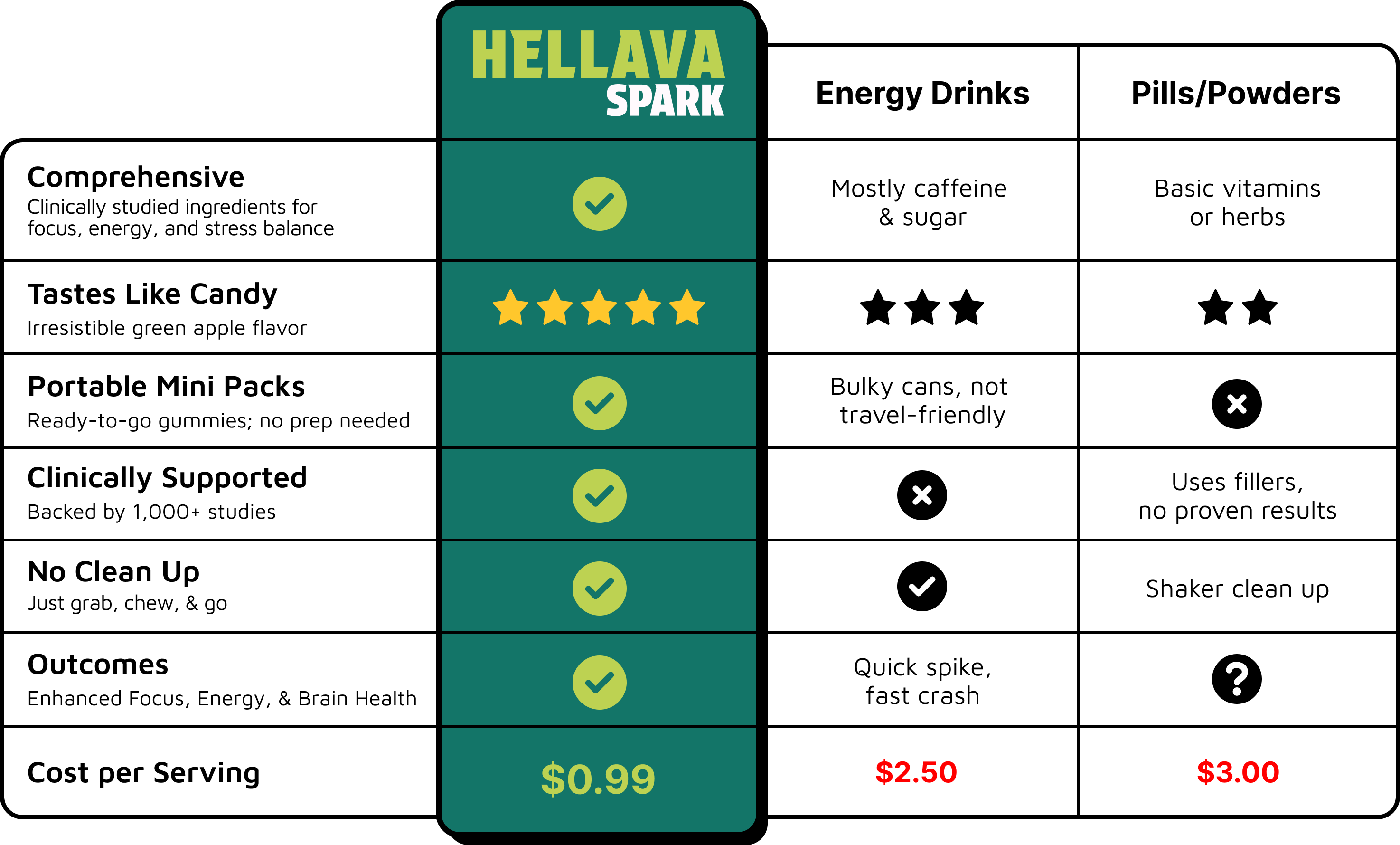 We use clinically studied ingredients at proven dosages, not trace amounts. Every ingredient in Hellava Spark serves a clear purpose; to improve focus, balance energy, and support long-term brain health.